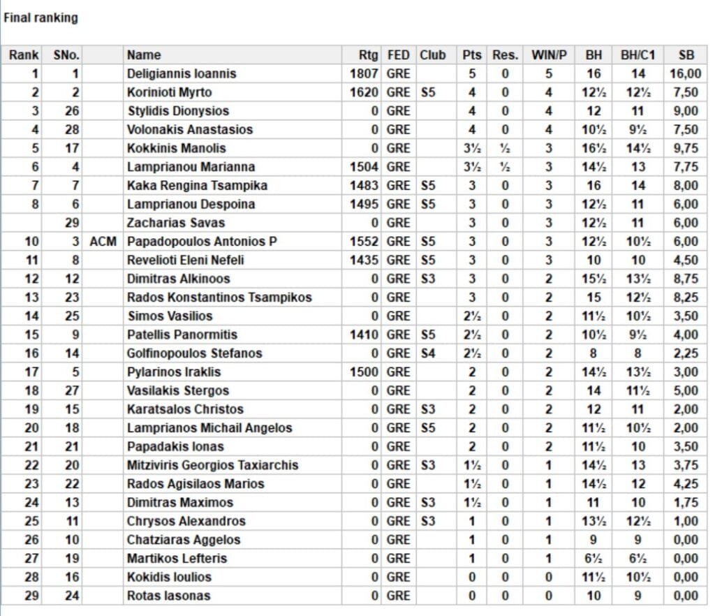 | 6 | Simos Vasilios | 2½ | 2 | 11½ | 10½ | 3,50 |