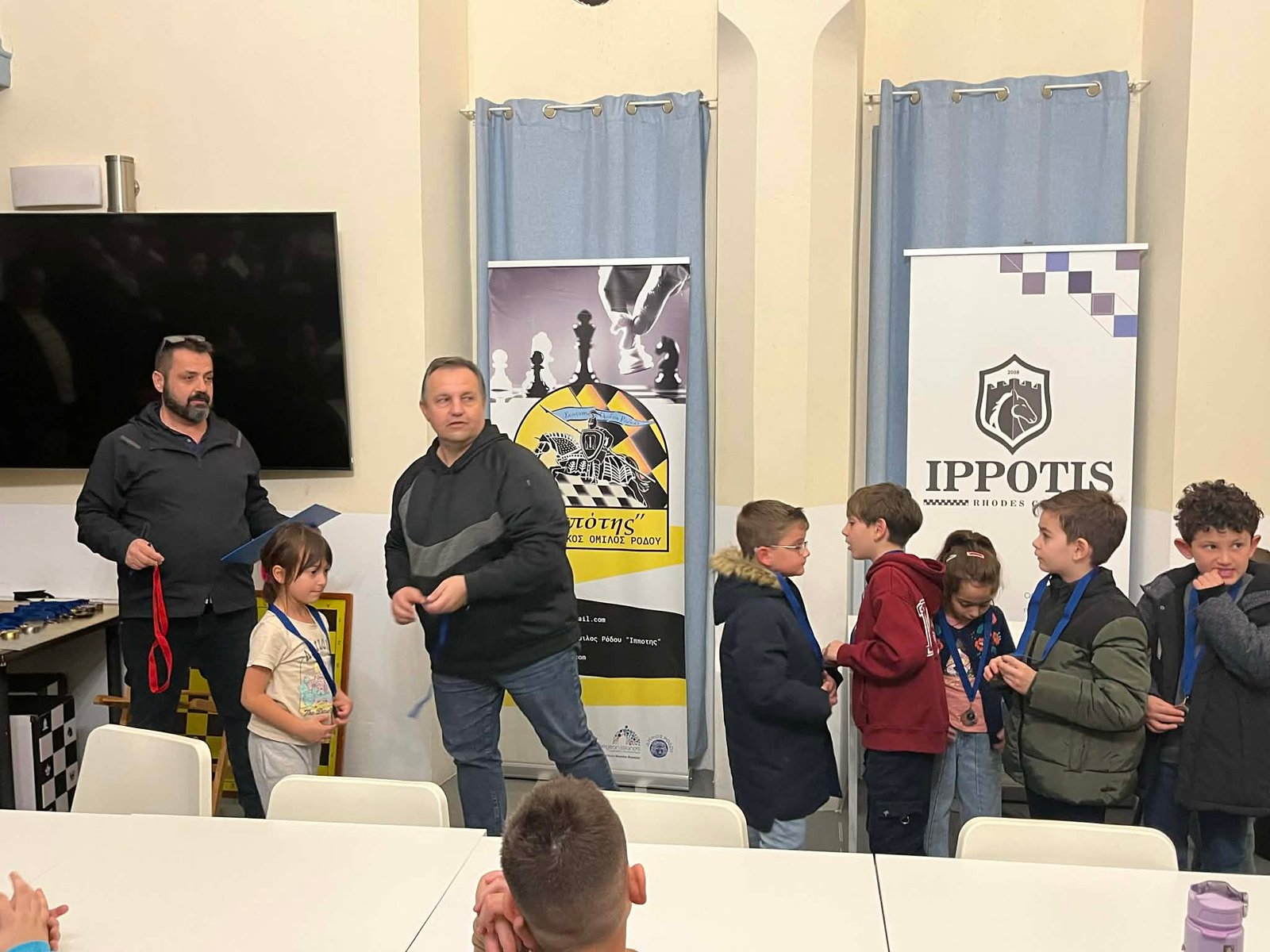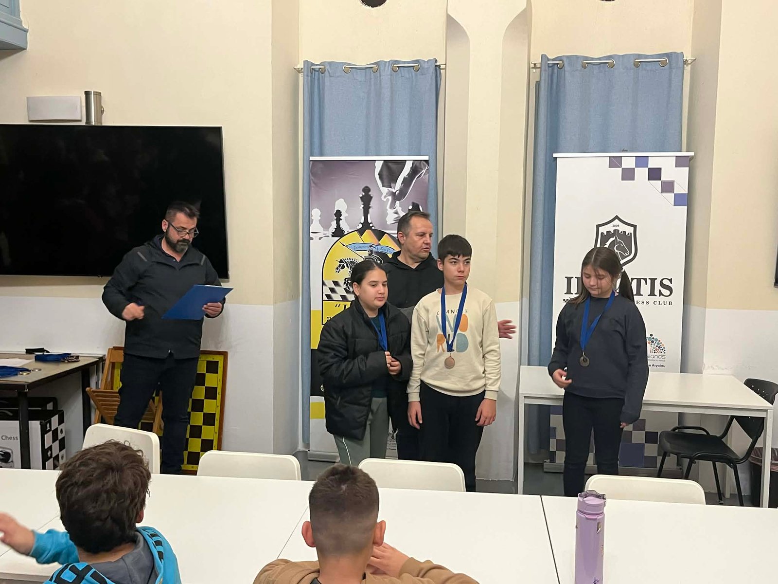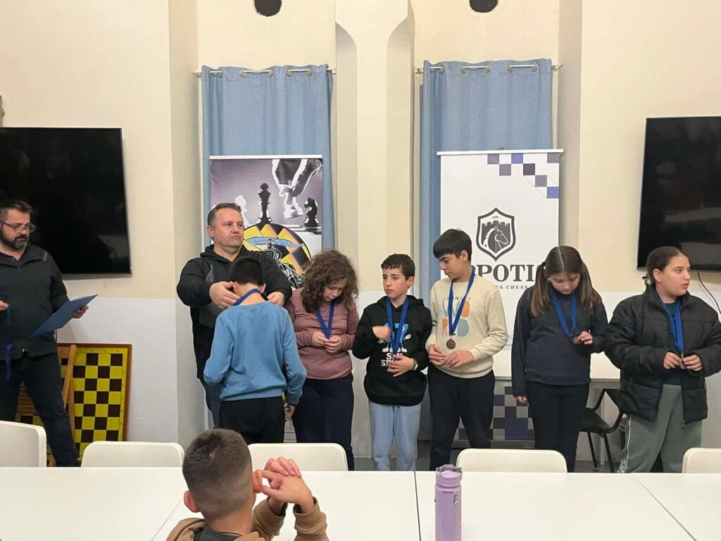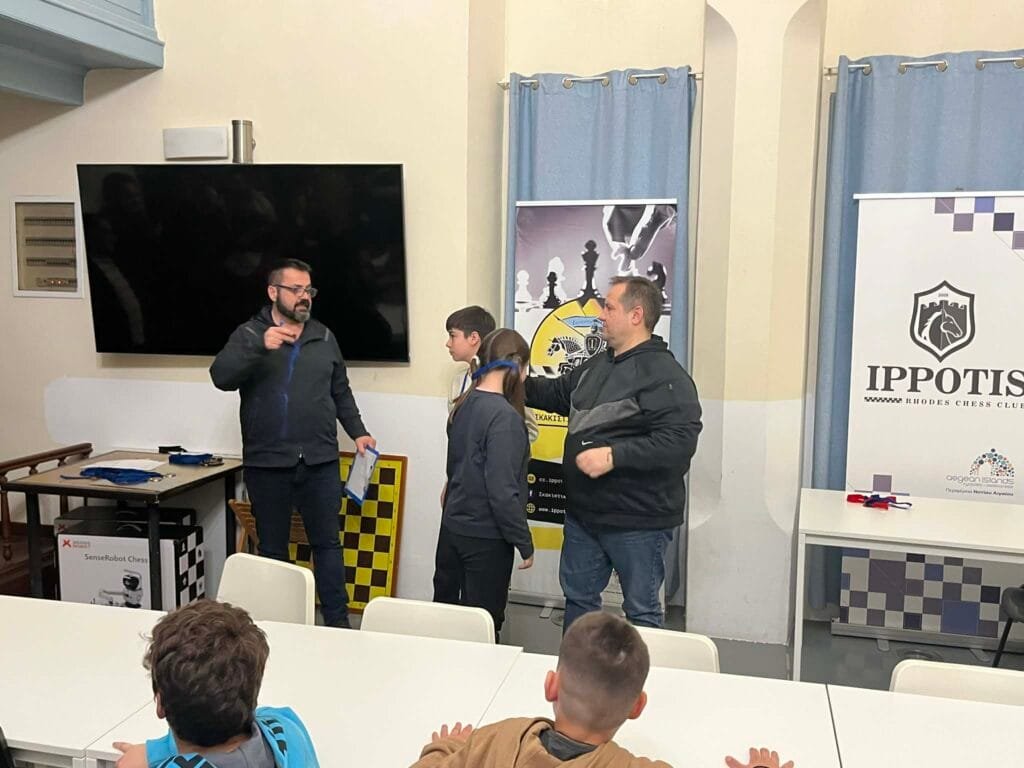 Τις απονομές που έκαναν ο ταμίας του ομίλου κ. Σπύρος Καραμποϊκης με τον Έφορο αγώνων κ. Νίκο Βασιλάκη, βραβεύοντας με μετάλλιο συμμετοχής, όλα τα παιδιά που αγωνίστηκαν. Όπως είπαν το σκάκι είναι ένα παιχνίδι με κανόνες που τα παιδιά πρέπει να εξοικειωθούν παίζοντας, και βραβεύονται όλα τα παιδιά για την προσπάθεια που κατέβαλαν στους 5 γύρους του τουρνουά. Η νίκη και η ήτα είναι μέσα στον αθλητισμό και πρέπει να μάθουμε να τη διαχειριζόμαστε. Η ευγενής άμιλλά και η προσπάθεια είναι αυτά που μετράνε πιο πολύ καθώς το σκάκι πάνω από όλα είναι παιχνίδι και μέσα από αυτό θα γίνουμε καλύτεροι άνθρωποι.