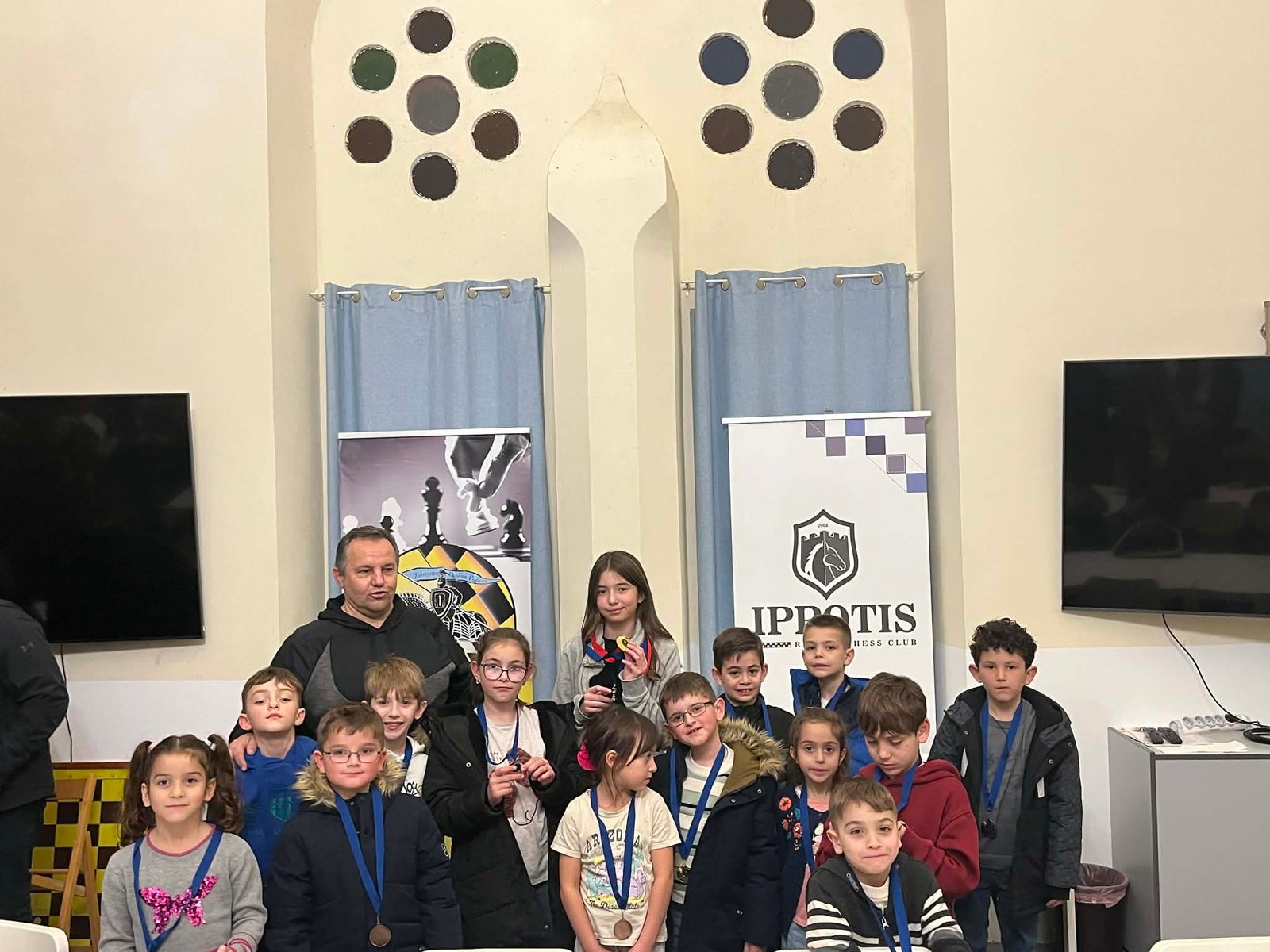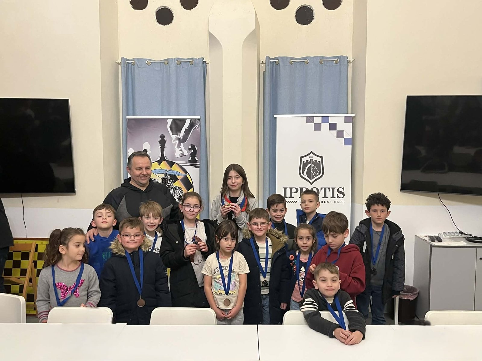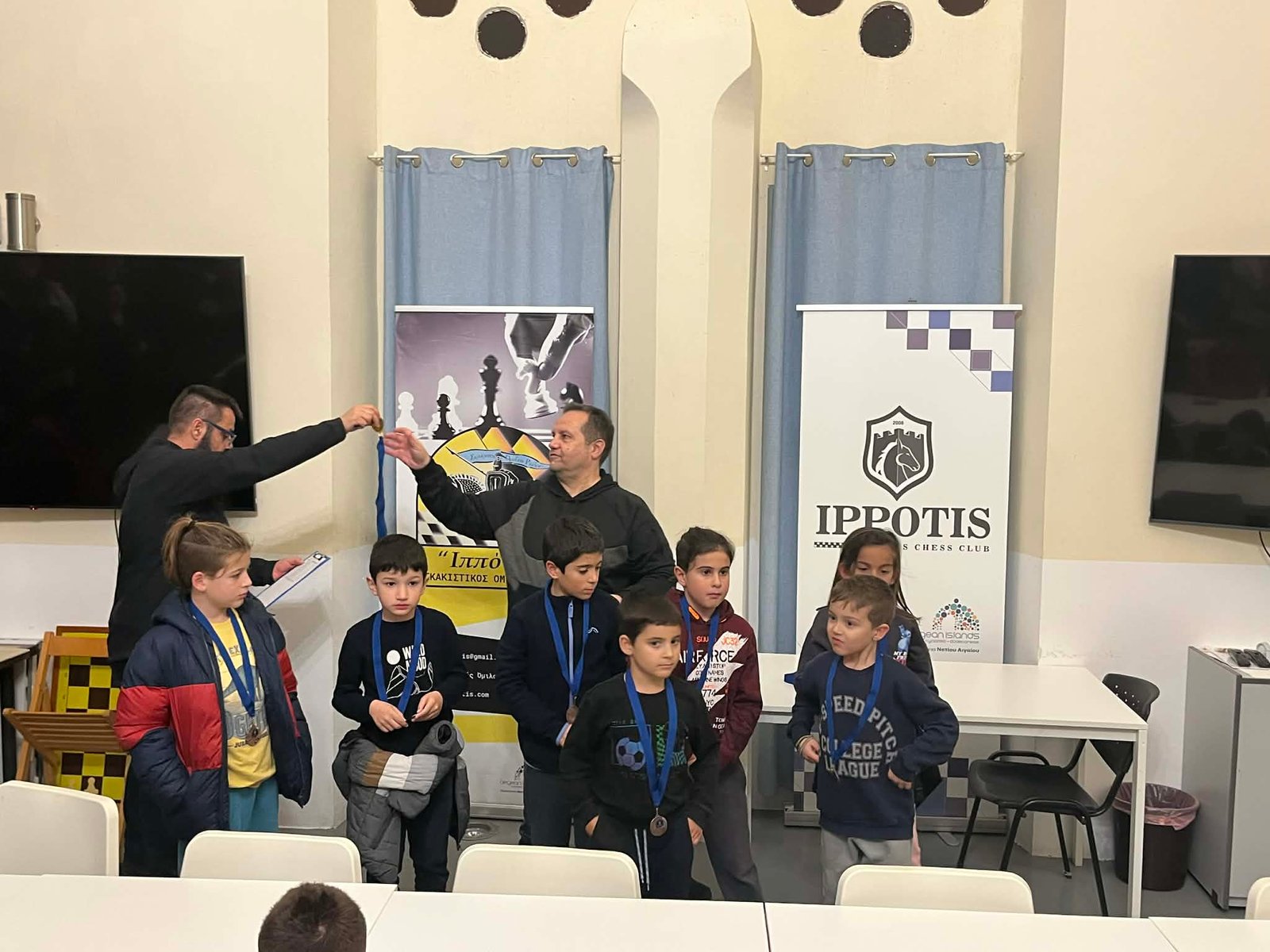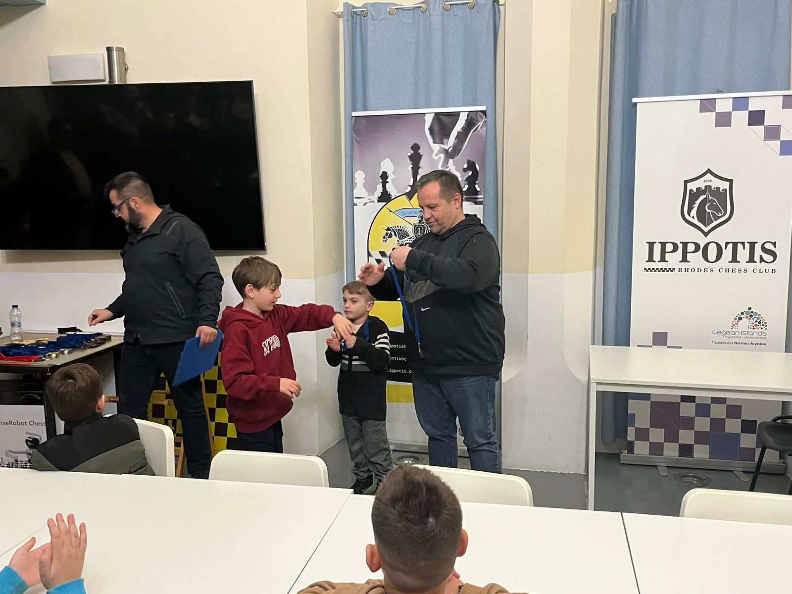 Τις απονομές που έκαναν ο ταμίας του ομίλου κ. Σπύρος Καραμποϊκης με τον Έφορο αγώνων κ. Νίκο Βασιλάκη, βραβεύοντας με μετάλλιο συμμετοχής, όλα τα παιδιά που αγωνίστηκαν. Όπως είπαν το σκάκι είναι ένα παιχνίδι με κανόνες που τα παιδιά πρέπει να εξοικειωθούν παίζοντας, και βραβεύονται όλα τα παιδιά για την προσπάθεια που κατέβαλαν στους 5 γύρους του τουρνουά. Η νίκη και η ήτα είναι μέσα στον αθλητισμό και πρέπει να μάθουμε να τη διαχειριζόμαστε. Η ευγενής άμιλλά και η προσπάθεια είναι αυτά που μετράνε πιο πολύ καθώς το σκάκι πάνω από όλα είναι παιχνίδι και μέσα από αυτό θα γίνουμε καλύτεροι άνθρωποι.